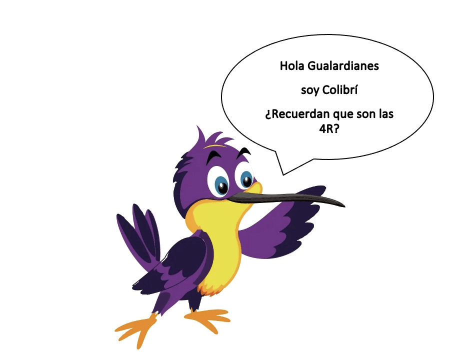 Los 4 súperpoderes Gualardianes para salvar el medioambiente, se conocen como las 4R y son los principios fundamentales de la educación ambiental en Gualaceo. Se trata de los hábitos que debemos tener en cuenta frente a los residuos. Las 4R son Reducir, Reutilizar, Reciclar y Recuperar y cada una tiene un superpoder.